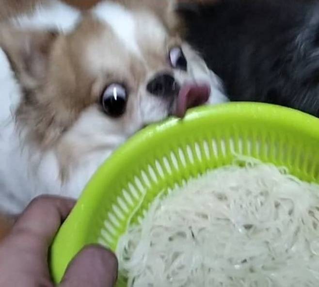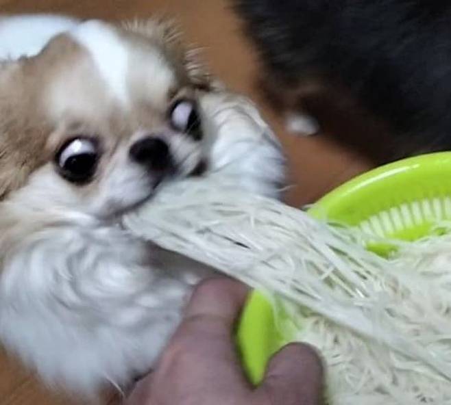치와와 강아지 타마오의 모습은 마치 "이 국수, 내 거 맞지? 빨리 먹어야지!"라고 말하는 것처럼 보였는데요.