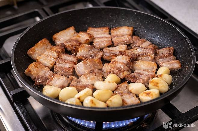이때 통마늘 8알을 편으로 썰어 넣어 함께 굽는다. 마늘이 익으면서 고기 향이 한층 깊어진다. 삼겹살에서 나온 기름이 너무 많다면 일부만 덜어내고 다음 단계로 넘어가면 된다.