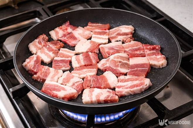 삼겹살 300g은 한입 크기로 자른다. 팬을 달군 뒤 고기를 올리고 맛소금과 후춧가루를 약간 뿌린다. 불은 중약 불 정도가 좋다. 너무 센 불에서 바로 익히면 겉만 타고 속은 충분히 익지 않을 수 있다.