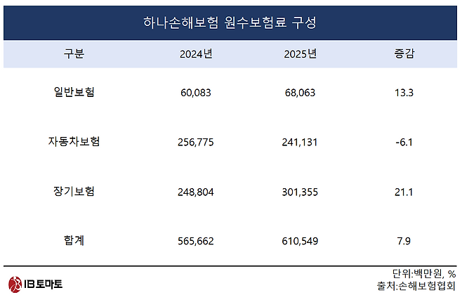 14일 손해보험협회 통계 자료에 따르면 하나손해보험은 지난해 보험료 수익으로 총 6105억원을 기록해 전년도 5657억원 대비 7.9%(448억원) 증가했다. 보험 종목별로 ▲일반보험 681억원 ▲자동차보험 2411억원 ▲장기보험 3014억원 등이다.