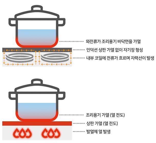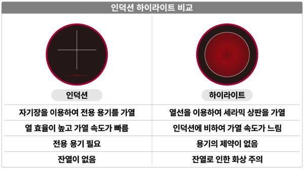 인덕션은 '용기 가열' 방식이고 하이라이트는 '상판 가열' 방식이다.