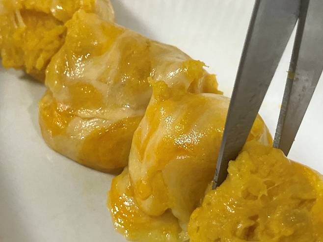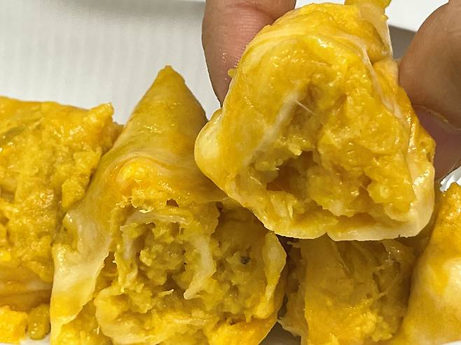 겉에는 치즈로 감싸졌고, 안쪽에는 으깬 고구마가 들어 있습니다. 치즈와 고구마 조합이라 마치 고구마 피자를 먹는 느낌도 있습니다.