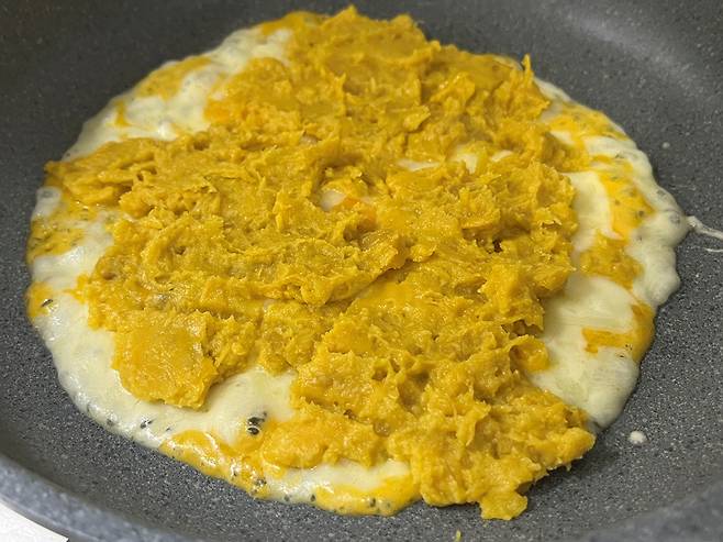 모짜렐라 치즈가 녹을 때까지 기다리세요. 치즈가 녹으면 그 위에 아까 고구마 으깨서 펼친 것을 올립니다.