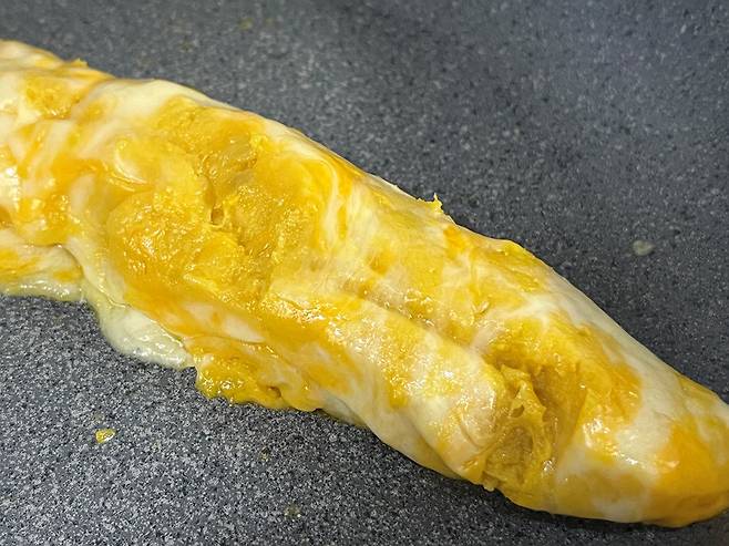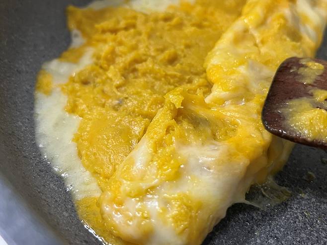 이제 가스레인지 불을 끄고 치즈가 살짝 굳기를 기다립니다. 어느 정도 굳으면 계란말이 하듯 치즈와 고구마를 돌돌 말아 주세요.