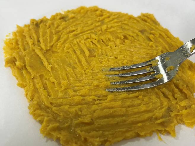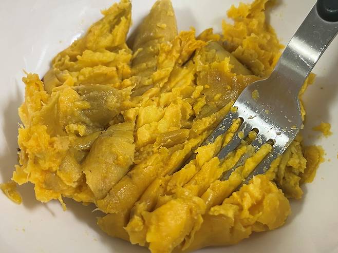 고구마는 촉촉하게 쪄낸 후 포크로 으깹니다. 덩어리가 남지 않도록 곱게 으깨는 것이 좋습니다.