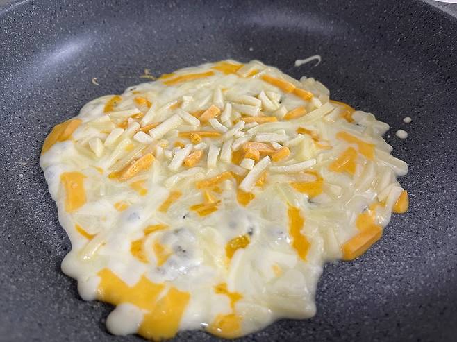 후라이팬을 올린 뒤 약불로 맞춥니다. 모짜렐라 치즈 약 1스푼을 팬에 고루 올립니다. 되도록 동그란 모양이 되도록 하세요.