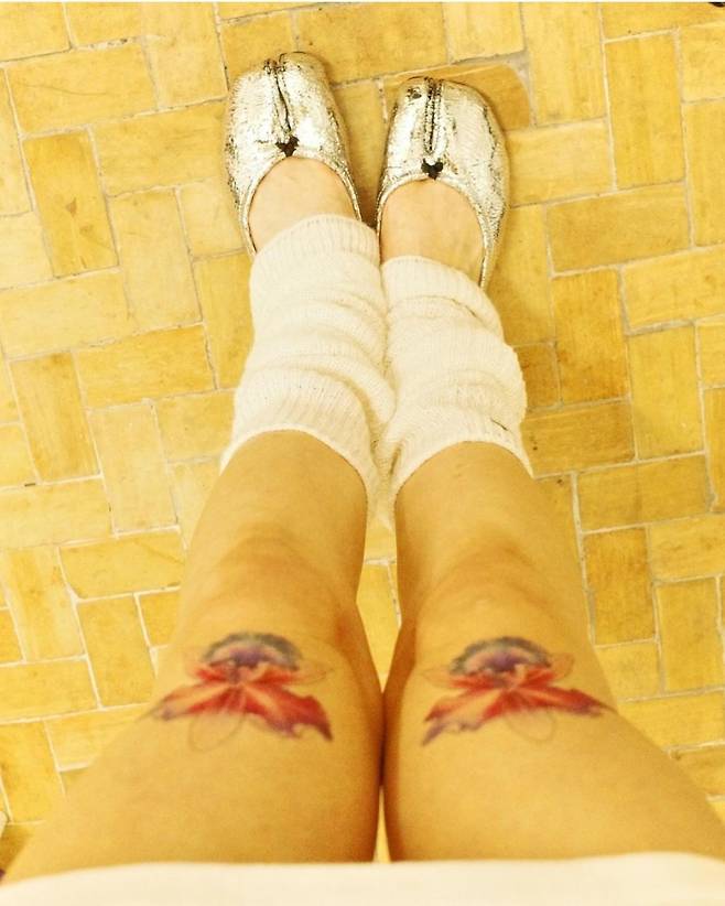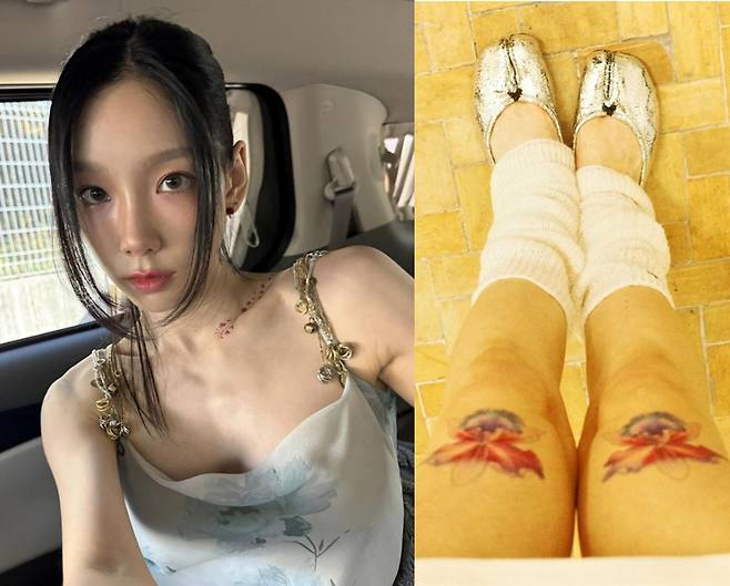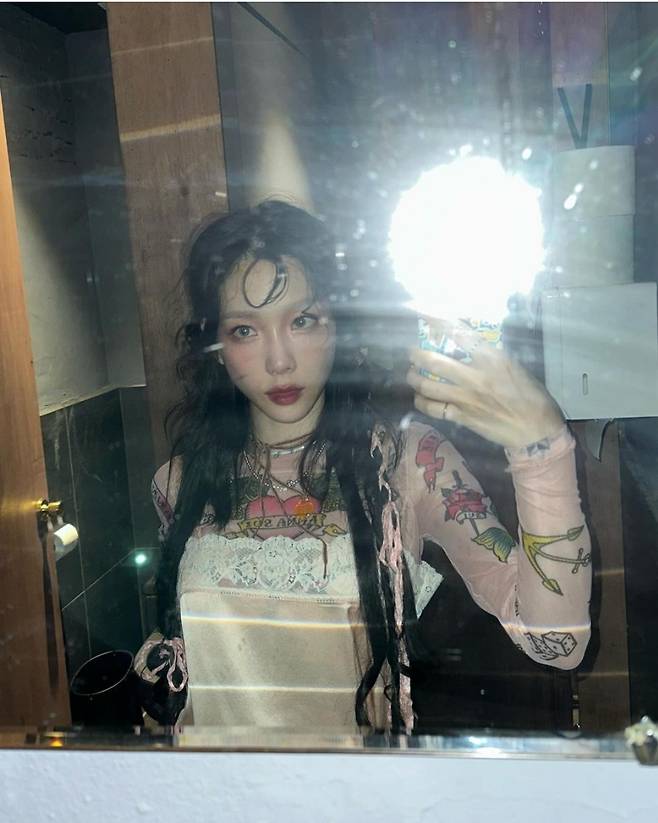 태연은 타투 시스루 스타일의 그림이 그려진 얇은 긴팔을 착용했습니다. 태연은 그 위에 레이스 슬립을 레이어드하여 편안해 보이면서도 스타일리시한 이미지를 연출하였습니다. 또, 태연은 니트 레그 워머와 글리터 돼지코 구두를 착용하여 최근 인기 있는 발레 코어 룩까지 소화했습니다. 특히 태연은 요즘 핫한 일명 ’술톤 메이크업‘을 선보였습니다. ’술톤 메이크업‘은 블러셔를 강조하기 위해 의도적으로 블러셔의 채도를 높이거나 많은 양을 바르는 메이크업을 의미합니다.