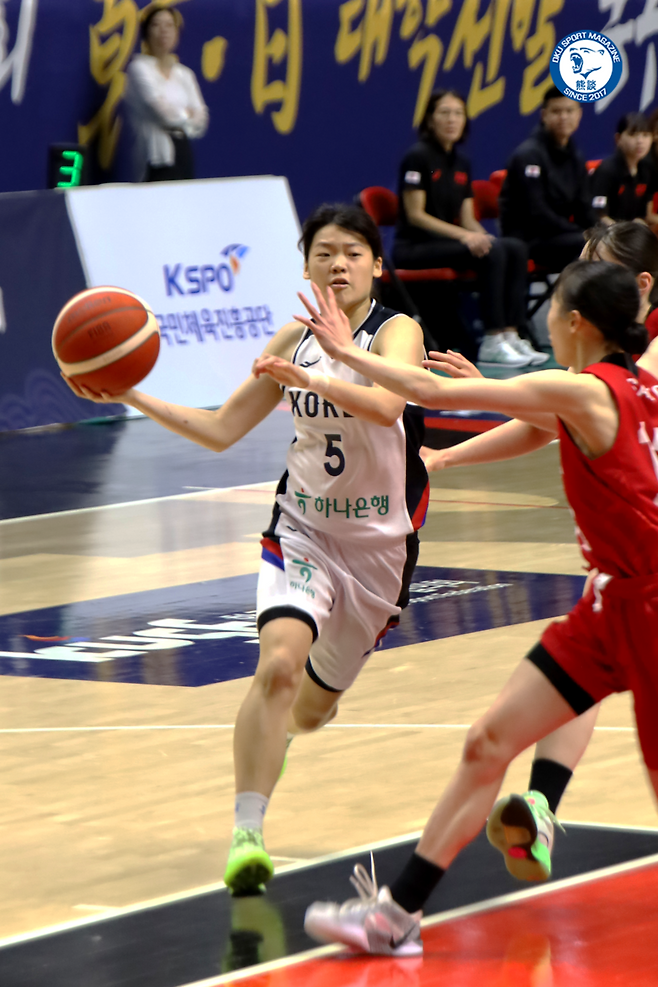 국가대표 데뷔 경기에서 4득점을 올렸던 김준영은 이튿날(5/17) 17득점 6어시스트로 앞선을 이끌었습니다. 1쿼터에 한국이 외곽포로 점수를 쌓았습니다. 이때 김준영도 석 점 2개를 꽂아 힘을 보탰습니다.