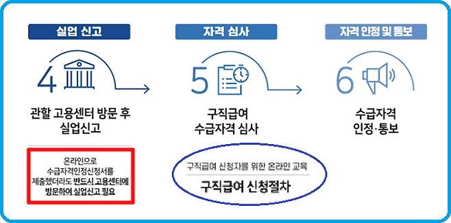 ‘실업급여 수급자격신청서’는 고용센터의 장에게 구직급여 수급요건을 갖추었다는 것을 인정해 달라고 요청하는 것이다. 신청서는 온라인으로도 제출할 수 있지만, 반드시 교용센터를 방문해야 신청절차가 완료된다. 고용센터를 방문한 날이 구직급여 수급자격을 인정받는 신청일이 된다. 고용센터는 교육을 수료한 날로부터 14일 이내 방문해야 한다.