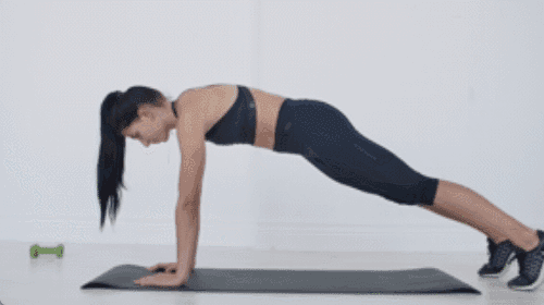 매트에 플랭크 자세로 엎드립니다. 왼손을 들어 오른쪽 어깨를 터치한 뒤 원위치합니다. 오른손을 들어 왼쪽 어깨를 터치한 뒤 돌아옵니다. 플랭크 자세를 유지하며 손을 번갈아 움직여 반복합니다.