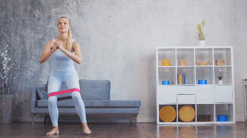 바닥에 서서 다리 사이에 밴드를 착용하고 손은 가슴 앞에 모읍니다. 무릎을 살짝 구부린 상태를 유지합니다. 왼발을 왼쪽으로 이동시키며 사이드 워크 동작을 진행합니다. 이어서 오른발을 오른쪽으로 이동시키며 반복하고, 시선은 정면을 유지합니다.