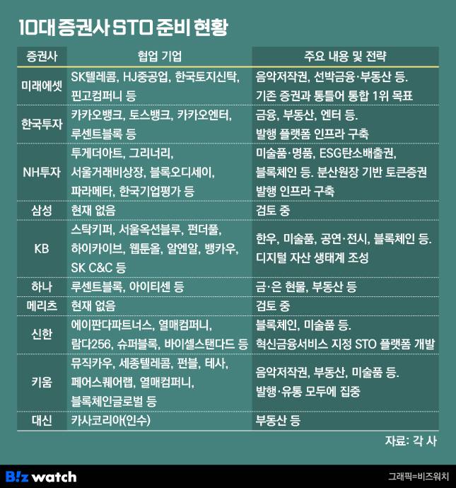 자기자본 기준 국내 최대 증권사인 미래에셋증권은 증권사 중 가장 먼저 디지털자산 비즈니스 전담 조직을 꾸린 데 이어 HJ중공업, 한국토지신탁과 STO 사업 활성화를 위한 업무협약(MOU)을 맺었다. 또 음원 수익 공유 플랫폼 '핀고'를 운영하는 핀고컴퍼니와도 협력하기로 했다.