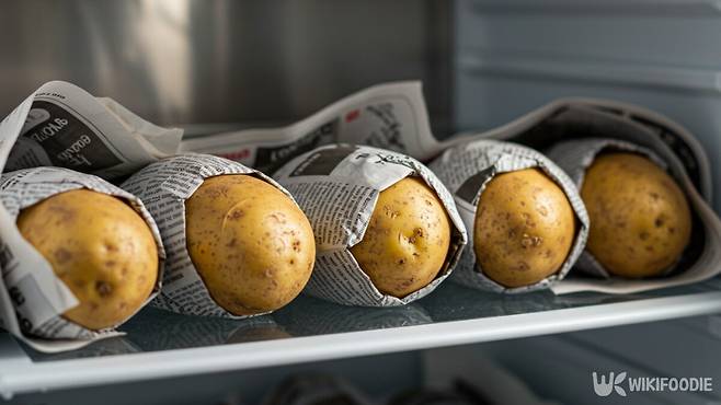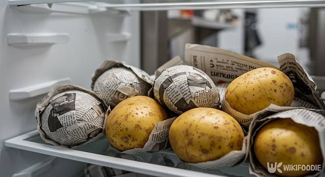 감자를 냉장고에 넣기 전 반드시 해야 할 준비가 있다. 감자를 하나하나 신문지로 싸는 것이다. 신문지는 빛을 차단하는 효과가 있다. 동시에 신문지는 감자 겉면의 습기도 흡수한다.