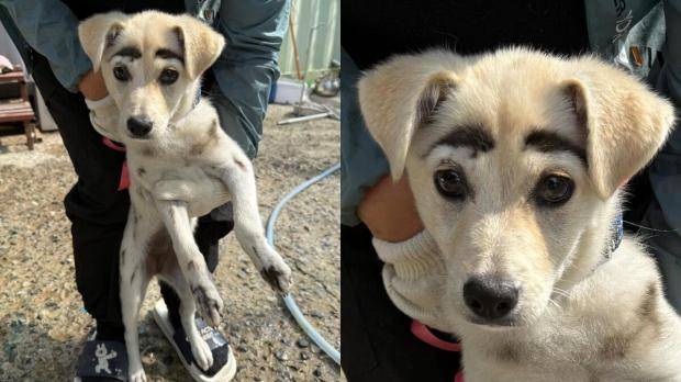 발견 당시 강아지의 얼굴과 몸에는 진한 '매직'이 칠해져 있었다. 수성 매직인지 유성 매직인지는 알 수 없지만, 어쨌든 강아지 얼굴에는 진한 눈썹이 그려져 있는 모습이다.