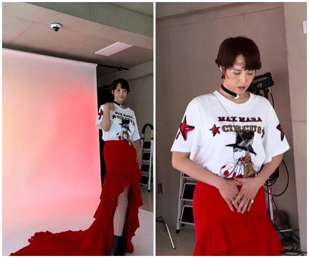 김선아는 자신의 인스타그램에 "happyweekend. '아이고배야.? ??ㅋ"라는 글과 함께 짧은 영상과 사진을 올렸다. 사진에서 김선에는 화려한 패턴이 있는 흰색 반소매 셔츠에 빨간색 스커트로 강렬한 인상을 남겼다.