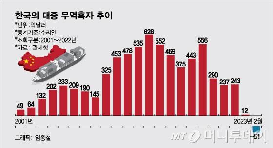 그런데 작년 5월 대중 무역수지가 28년 만에 적자로 전환하더니 지난해 연간 대중 무역흑자는 12억1000만달러로 쪼그라들었다. 2021년(243억달러) 대비 95% 넘게 급감한 규모다. 올해 들어 1~2월 누적 대중 무역적자는 이미 51억달러를 초과하는 등 대중 교역은 무역흑자에서 무역적자 구도로 급격히 전환되고 있다.