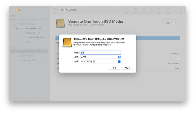 외장 SSD 최초 연결했을 때는 APFS 포맷 디스크가 아니라는 안내창이 뜨게 된다. APFS 포맷은 애플 규격을 말하는 것이며 디스크 설정을 통해 간단하게 APFS 포맷으로 변경이 가능하다. 단, 주의할 점은 APFS 포맷으로 변경한 외장 SSD는 윈도우 PC에서 인식이 안될 수 있으니 맥 전용 외장 SSD를 따로 구비해 두는 것을 추천한다.