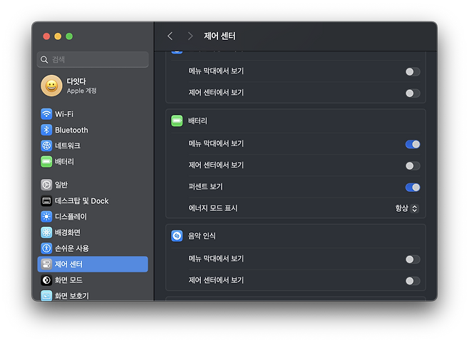 설정 방법은 간단하다. 설정에서 제어 센터로 가게 되면 하단에서 배터리 항목을 발견할 수 있다. 메뉴 막대에서 보기 항목을 활성화하고 에너지 모드 표시는 항상으로 하면 설정 완료. 이제 화면 최상단 메뉴 막대에서 배터리를 클릭해 보면 저전력 아이콘이 생긴 것을 발견할 수 있다.
