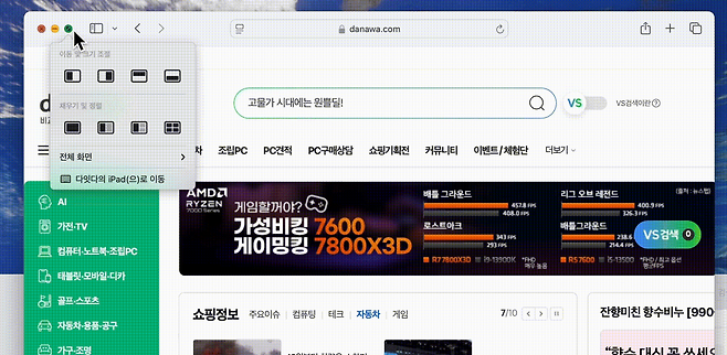 두 번째 방법은 왼쪽 상단 창 최대화 버튼을 길게 누르면 된다. 상하좌우 조절부터 4분할까지 8가지 모드 중에서 직접 선택할 수 있다. 마지막 방법은 옵션 키를 누른 상태에서 창을 측면으로 드래그하면 자동으로 흰색 테두리가 생겨 손쉽게 타일 정리를 할 수 있다.