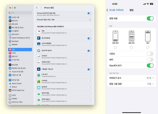 아이폰 미러링을 한 이후에 알림이 너무 자주 뜨는 것이 거슬린다면 맥 설정에서 알림 항목에 들어가 아이폰 알림 허용 자체를 비활성화 하거나 개별 앱 단위로 알림 해제를 할 수 있다. 아이폰 앱 설정에서도 알림 항목에 있는 'Mac에서 보기'를 해제하면 맥으로 알림이 가는 것을 끌 수 있다.