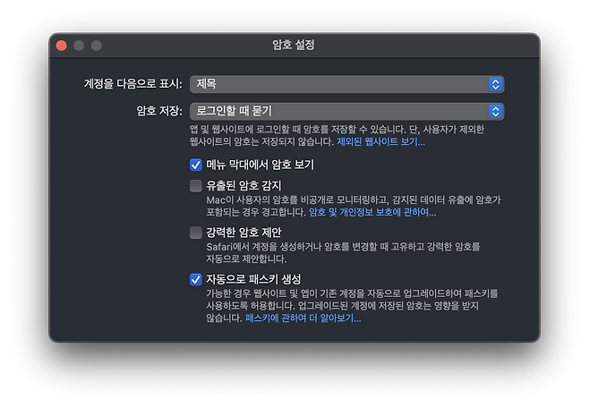 런치패드에서 암호앱을 찾아 실행하는 방법도 있지만 더 간편하게 사용하려면 상단 메뉴 막대에 암호 기능을 추가하면 된다. 설정하는 방법은 암호앱을 실행한 다음 설정에 들어가 '메뉴 막대에서 암호 보기'를 선택하면 끝난다. 이제 암호가 필요할 때마다 화면 최상단 메뉴 막대에서 암호 아이콘을 클릭하도록 하자.