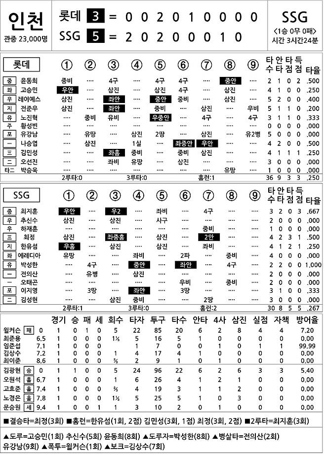 [2024 KBO리그 기록실] 롯데 vs SSG (3월 23일)