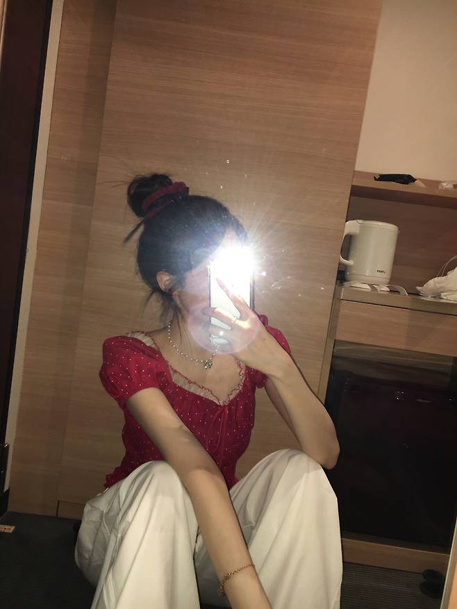 쨍한 레드 컬러에 미니 도트 패턴이 가득한 블라우스는