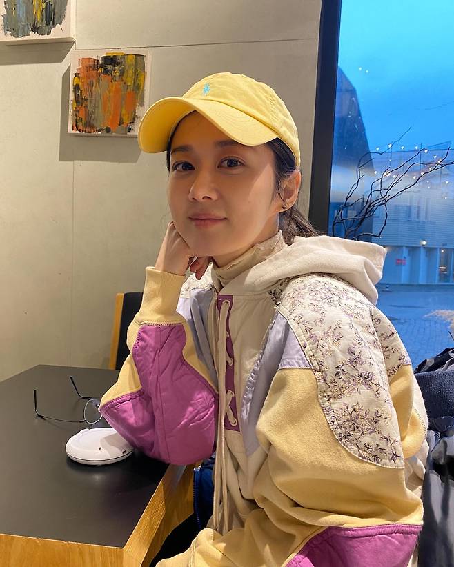 장나라는 노란색 캡과 화이트, 핑크, 옐로우가 조화를 이룬 컬러블록 후드 집업으로 활기찬 스포티 룩을 연출하고 있다. 플로럴 패턴이 믹스된 디자인으로 캐주얼하면서도 세련된 감각을 보여주며, 실내 카페에서도 돋보이는 개성 있는 스타일링을 완성했다.