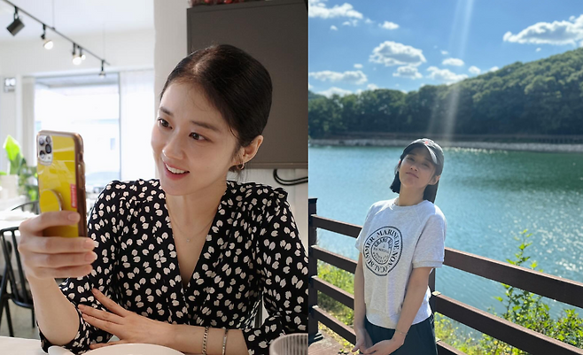 호수를 배경으로 한 야외에서는 그레이 반팔 티셔츠와 캡으로 편안하고 자연스러운 룩을 선보이고 있다. 미니멀한 로고 디자인의 티셔츠로 깔끔함을 강조하면서도, 자연 속에서의 여유로운 분위기를 효과적으로 표현하고 있다.