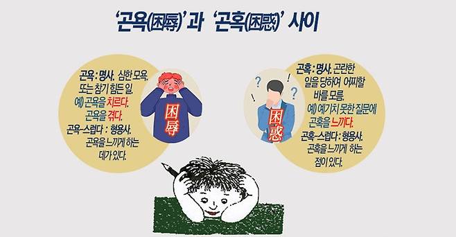 뜻도 명확하게 나뉜다. ‘곤욕’은 ‘심한 모욕, 참기 힘든 일’의 뜻이고, ‘곤혹’은 ‘곤란할 일을 당하여 어찌할 바를 모름’이다.