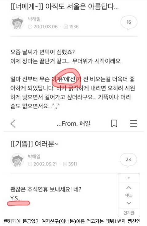 팬카페에 뜬금없이 여자친구의 이름을 적고가는 로맨스 놀랍다.
