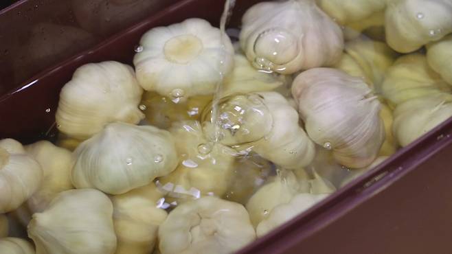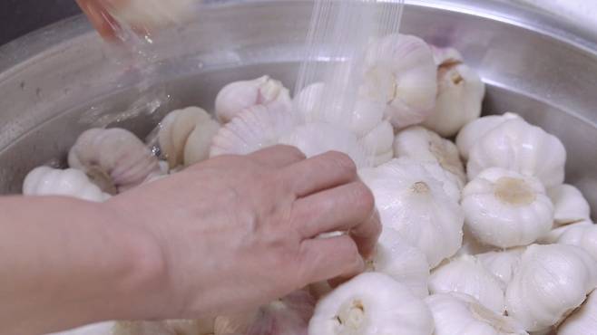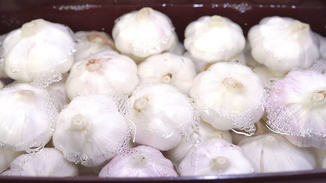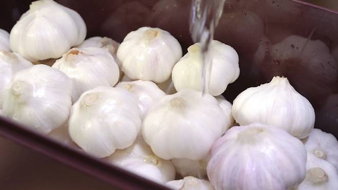 손질이 끝난 마늘은 대야에 담아 물에 2번 정도 깨끗이 잘 씻어 놓으세요.