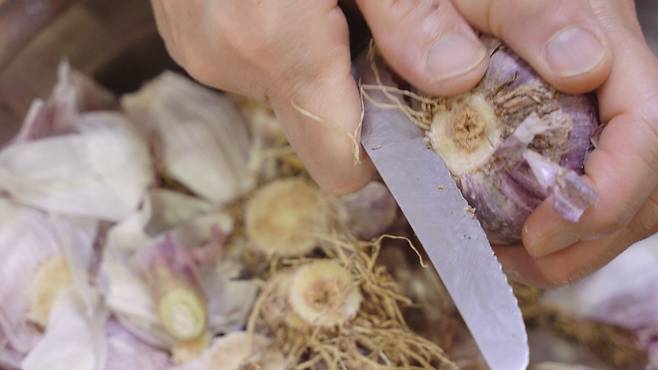 먼저 마늘을 손질하세요. 통마늘을 준비하고, 줄기는 가위로 잘라 내세요. 그리고 뿌리는 칼로 다듬고, 마늘 껍질 한 겹만 남긴 채 껍질을 제거해 주면 된답니다. 이렇게 하면 마늘 손질은 1차적으로 끝이에요.