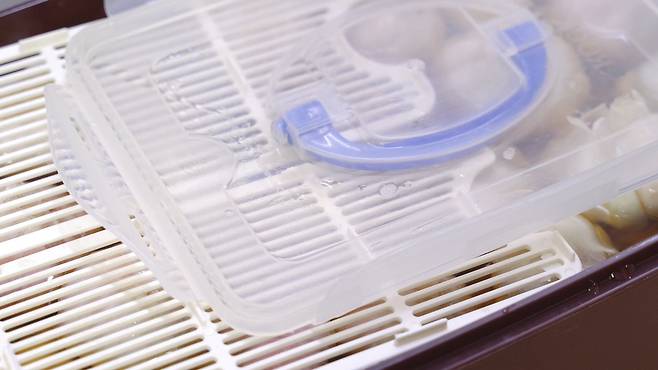 이제 물기를 제거할 차례인데요. 소쿠리에 마늘 밑동이 위쪽을 향하도록 넣어 물기를 빼세요.