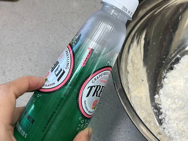 이제는 물 대신 탄산수를 활용해 보세요. 탄산수 속 이산화탄소 기포가 반죽에 들어가면 익히는 과정에서 작은 공기층을 만들어 바삭한 식감을 살려 줍니다.