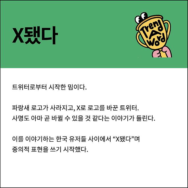 당장 오늘도 트위터 트렌딩에 로고 X로 나와 있다.