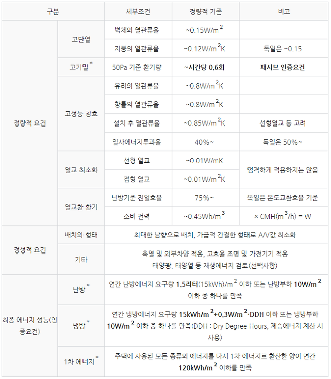 다음은 이러한 정의를 만족시키기 위해서 PHI가 제시한 요건에 한국 패시브 건축협회의 논의 결과를 추가한 것이다.