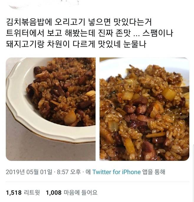 아까 누가 스퀘어에 올린 오리고기 김치볶음밥 맛있다는 아래 사진보고 레시피 궁금해서 원덬이가 찾아옴