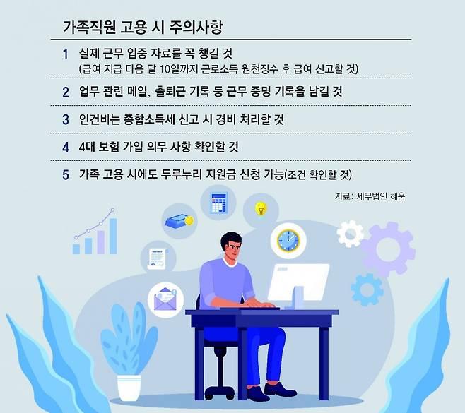 무엇보다 가족이 직원으로 실제 근무한다는 입증 자료가 있어야 한다는 점을 반드시 인지해야 한다. 가족 고용 시에도 각종 신고와 다양한 지원금 등이 적용되니 꼼꼼하게 준비하면 절세에 활용할 수 있을 것이다.