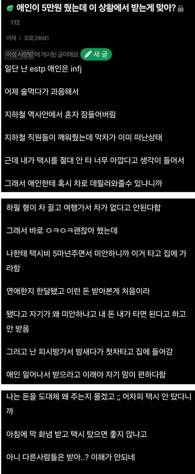 한 달 된 남자친구한테 5만 원 받은 게 이해 안되는 여자