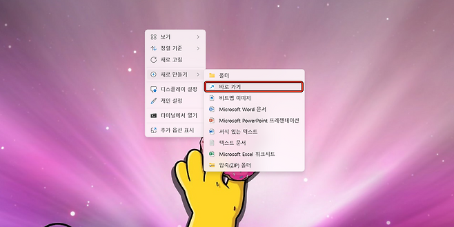 1). 바탕화면에서 마우스 우클릭 → 새로 만들기 →바로 가기를 선택합니다.