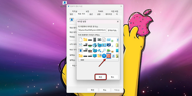4). 생성된 아이콘을 우클릭 → 속성 → 아이콘 변경으로 마음에 드는 모양으로 꾸며주세요.