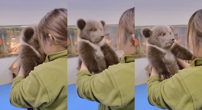 한 동물원에서 아기 곰이 사육사에게 사랑스럽게 안겨 있습니다. 사육사는 아기 곰을 품에 안고 부비부비하는 모습이 포착되었는데, 이 장면은 보는 이들에게 미소를 안겨주고 있습니다. 아기 곰은 처음에는 이게 무슨 일인가 했지만, 이내 사육사를 바라보며 편안한 표정을 지었습니다.