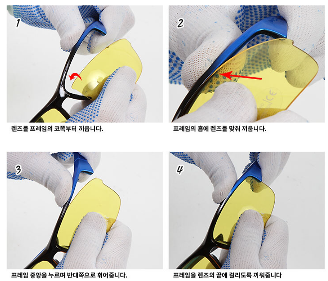 1) 렌즈를 프레임의 코쪽부터 끼웁니다.