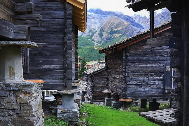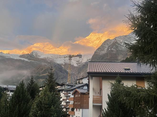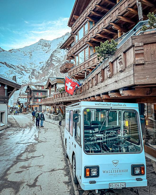 침침하고 적막한 버스 정류장을 나와 어둡고 적막한 상점가를 지나 호텔 크리스티나의 묵직한 나무문을 열었다. 불 켜진 간판을 지나칠 때마다 허기가 발동했지만, 일단 가방 무게와 축축한 밤안개에서 벗어나고 싶었다. 체크인을 하고, 내일 아침 케이블카를 무료로 탈 수 있는 사스탈 카드를 신청했다. 방으로 들어가니 먹을 수 있는 건 수돗물뿐이었다. 스위스에는 생수 대신 수돗물을 받아 마실 물병을 비치해 두는 호텔이 많다. 알프스 빙하에서 흘러온 수돗물로 샤워를 하고 삼키기도 하며 몸을 데우고 나서 내일 아침 조식을 기약하자, 라디에이터에 바짝 붙어 누웠다.