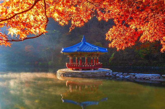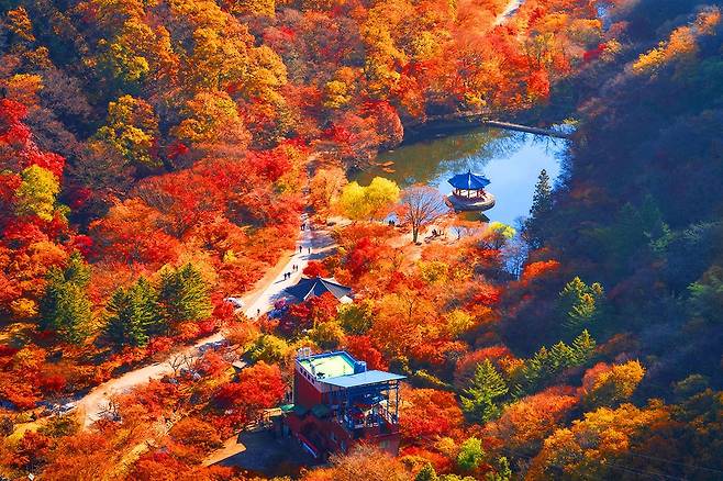 호남 5대 명산 내장산의 ‘우화정’에서 가을가을한 단풍나무와 수양버들을 반사하는 호수 경관을 감상해 보고, 내장산 케이블카와 내장사 일주문으로 추가 산행을 이어갈 수 있습니다.