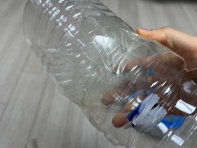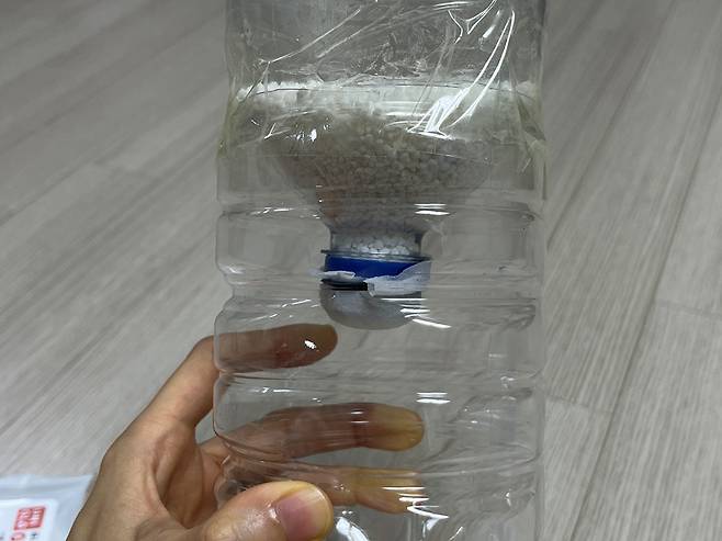 이렇게 입구 부분을 막은 페트병 부분을 거꾸로 한 다음 남은 페트병 부분이 끼워서 테이프로 고정시킵니다.