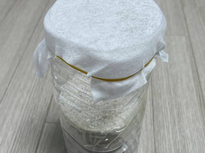 이제 윗 부분에 물티슈를 잘라서 덮고 고무줄로 고정시키세요.