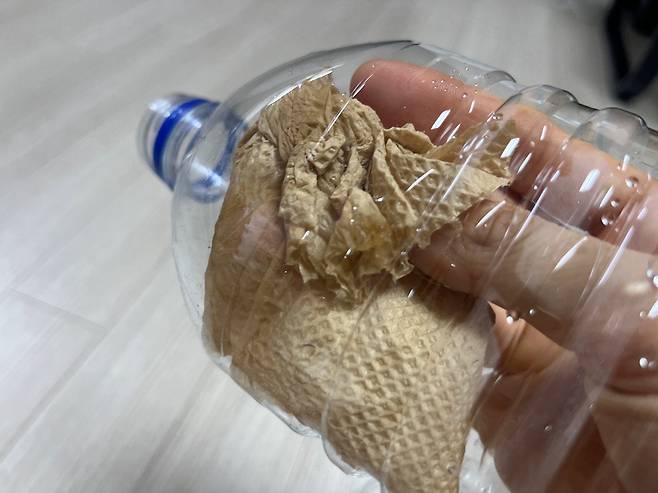물티슈 1장을 물기가 없게 말려서 사용합니다. 적당한 크기로 잘라서 페트병 입구에 씌우세요. 작은 고무줄을 끼우면 고정이 됩니다.