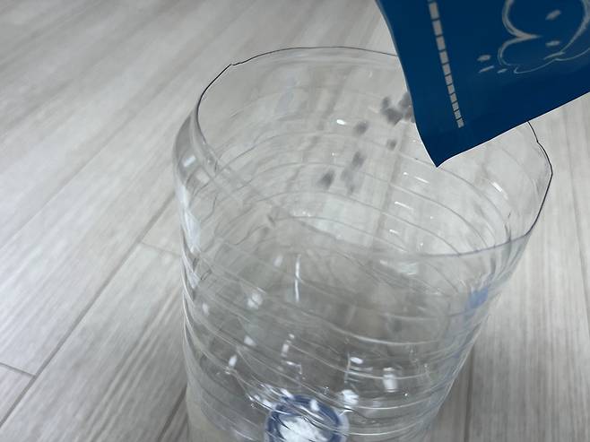 이제 이 안에 염화칼슘을 1/3 또는 1/2 정도 채우세요. 염화칼슘은 눈이 왔을 때 도로에 뿌리는 제설제로 익숙하지만, 사실 이 물질은 습기를 강력하게 흡수하는 제습제 역할도 합니다.